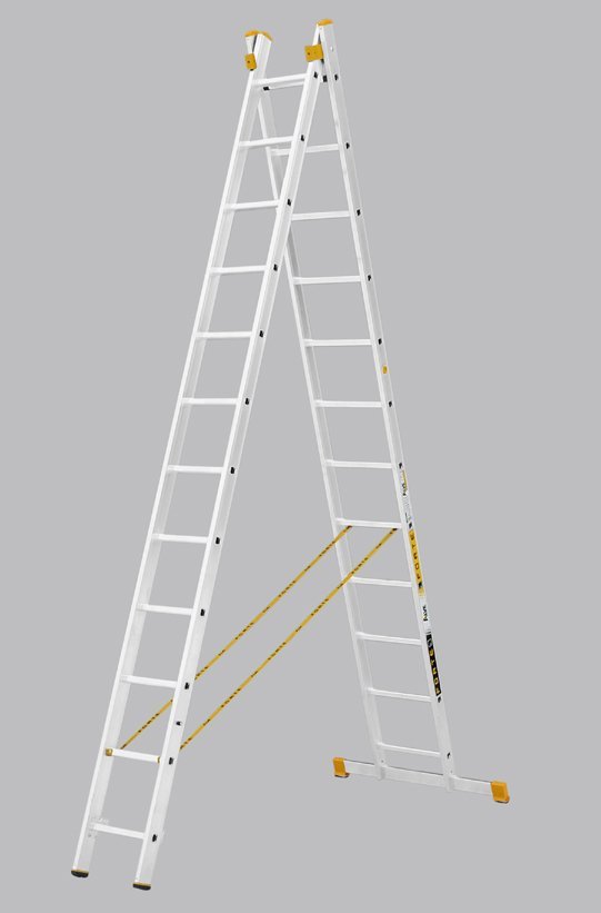 Two-piece Forte universal ladder. Number of partitions 2x14, max. extendable length 7.22 m, width 412 mm, yellow-black ends. These ladders are made to meet high durability and reliability while keeping the weight as low as possible. Maximum load capacity 150 kg.