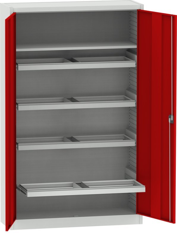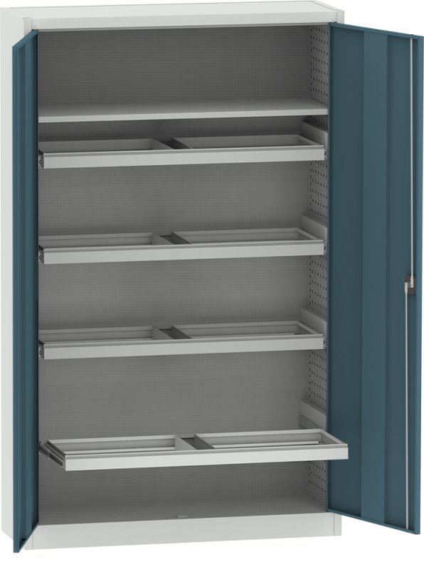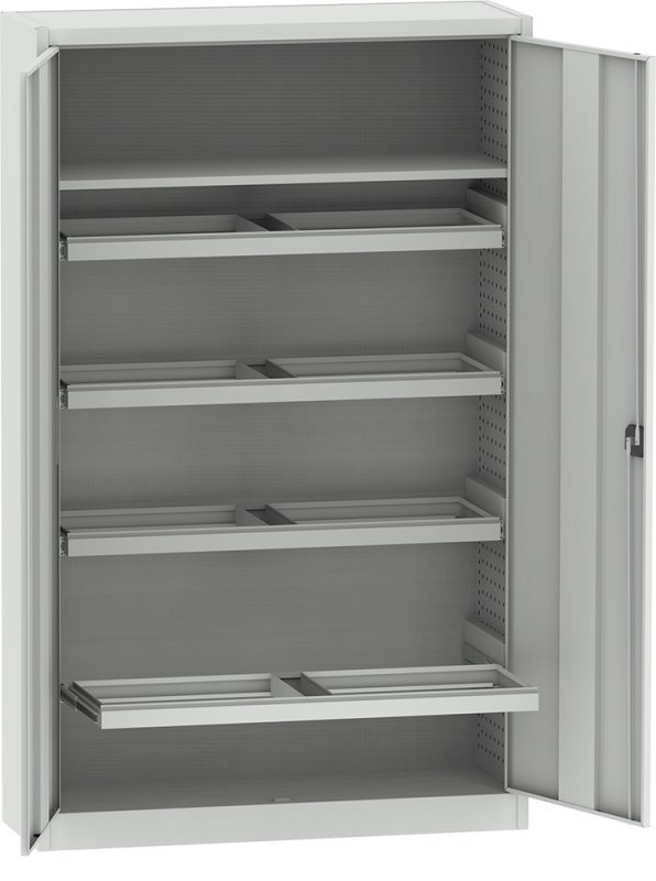 Two-door metal cabinet with four pull-out frames and one shelf. Dimensions height 1950 x width 1200 x depth 400 mm. Locking with a cylindrical wheelbase lock. Body color light gray.