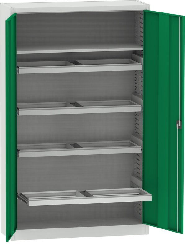 Two-door metal cabinet with four pull-out frames and one shelf. Dimensions height 1950 x width 1200 x depth 400 mm. Locking with a full description and parameters