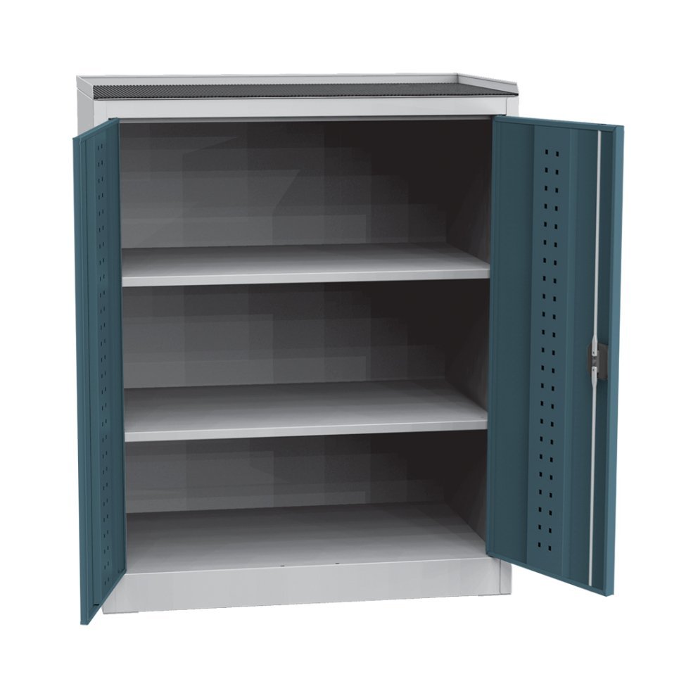 Two-door metal cabinet with 2 shelves, 1 drawer and internal DVB perforation for installation of DUS_11_Z10 drawers. Dimensions height 1180 x width 950 x depth 500 mm. Locking with a cylindrical wheelbase lock. Body color light gray.