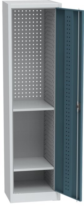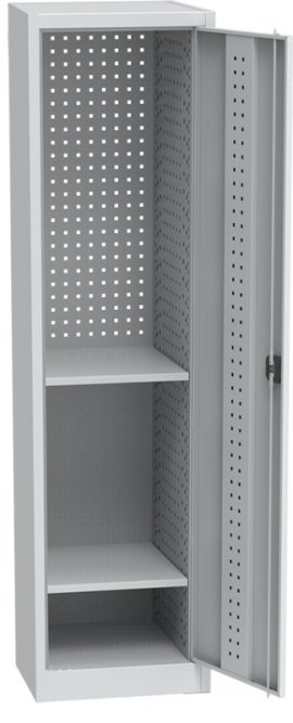 One-door metal cabinet with 2 shelves and internal DVB perforation for installation of DUS_13_Z10 drawers. Dimensions height 1950 x width 505 x depth 500 mm. Locking with a cylindrical wheelbase lock. Body color light gray.