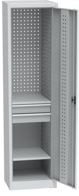 One-door metal cabinet with 2 shelves, 2 drawers and internal DVB perforation for installation of DUS_13_Z10 drawers. Dimensions height 1950 x width 505 x depth 500 mm. Locking with a cylindrical wheelbase lock. Body color light gray.