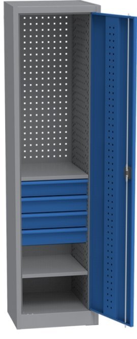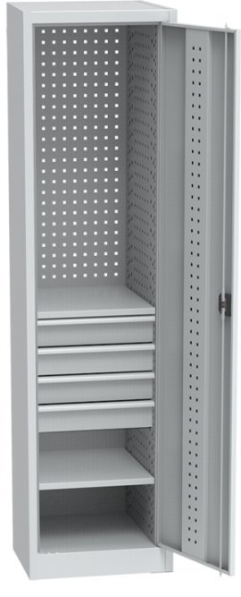One-door metal cabinet with 2 shelves, 4 drawers and internal DVB perforation for installation of DUS_13_Z10 drawers. Dimensions height 1950 x width 505 x depth 500 mm. Locking with a cylindrical wheelbase lock. Body color light gray.