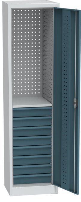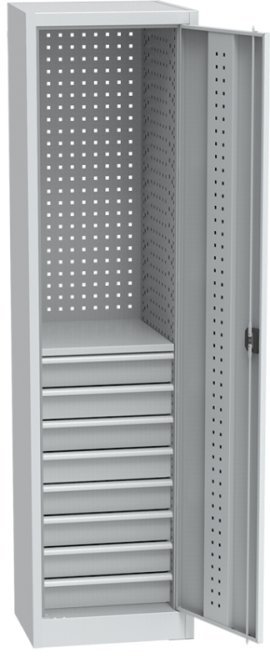 One-door metal cabinet with 1 shelf, 8 drawers and internal DVB perforation for installation of DUS_13_Z10 drawers. Dimensions height 1950 x width 505 x depth 500 mm. Locking with a cylindrical wheelbase lock. Body color light gray.
