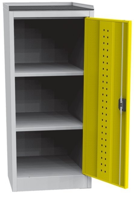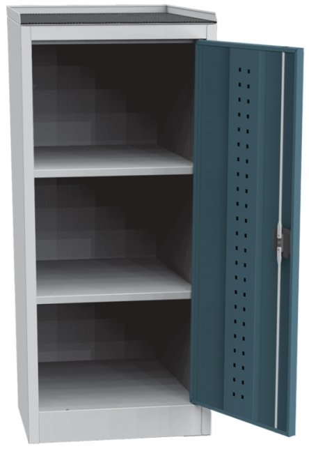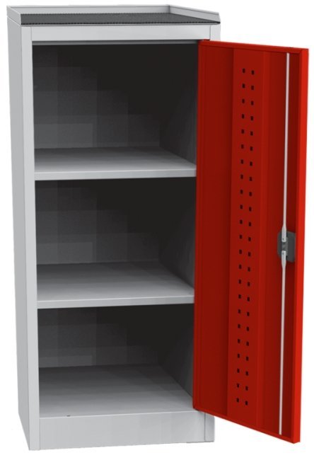 One-door metal cabinet with 2 shelves and internal DVB perforation for installation of DUS_13_Z10 drawers. Dimensions height 1950 x width 505 x depth 500 mm. Locking with a cylindrical wheelbase lock. Body color light gray.
