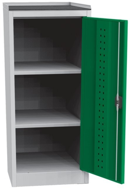 One-door metal cabinet with two shelves. Dimensions height 1180 x width 505 x depth 500 mm. Locking with a cylindrical wheelbase lock. Body color light gray.