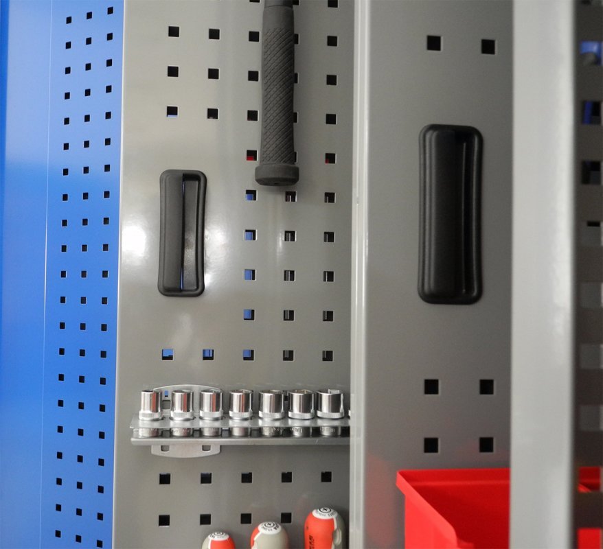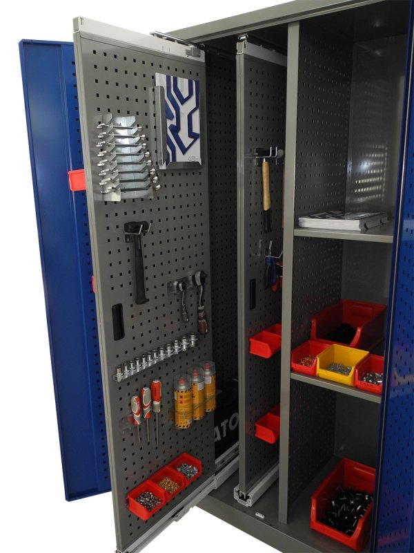 Universal workshop cabinet for neatly storing tools and equipment. Internal arrangement - 2 x extendable double-sided perforated panel, 5 x height-adjustable shelves with a load capacity of 60 kg. The cabinet is divided into a section for height-adjustable shelves and a section for retractable perforated panels. The sides of the cabinet are fitted with perforated panels from the inside. Dimensions in mm (H x W x D) 1950 x 950 x 600. Body color RAL 7037 gray, doors RAL 5005 blue.