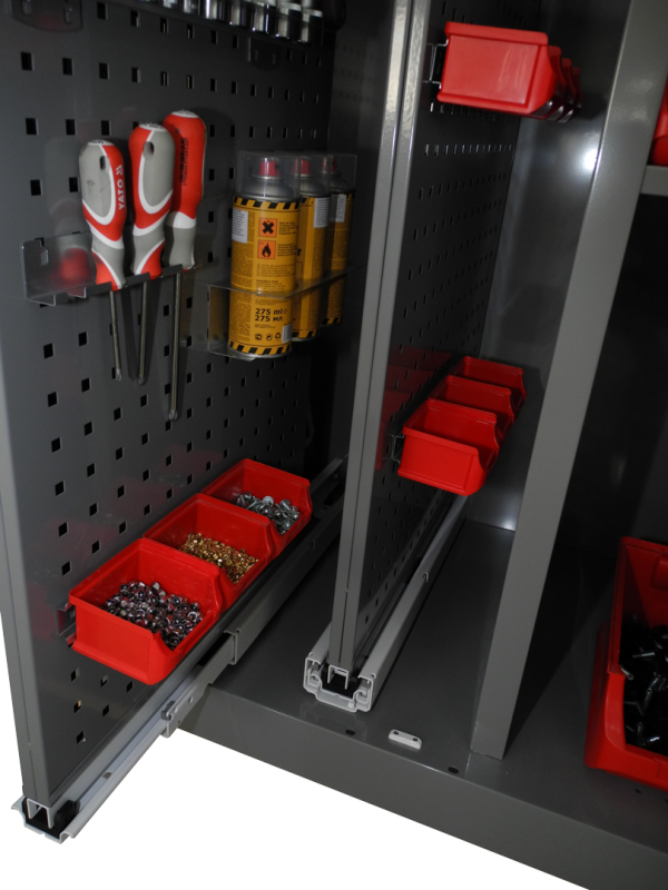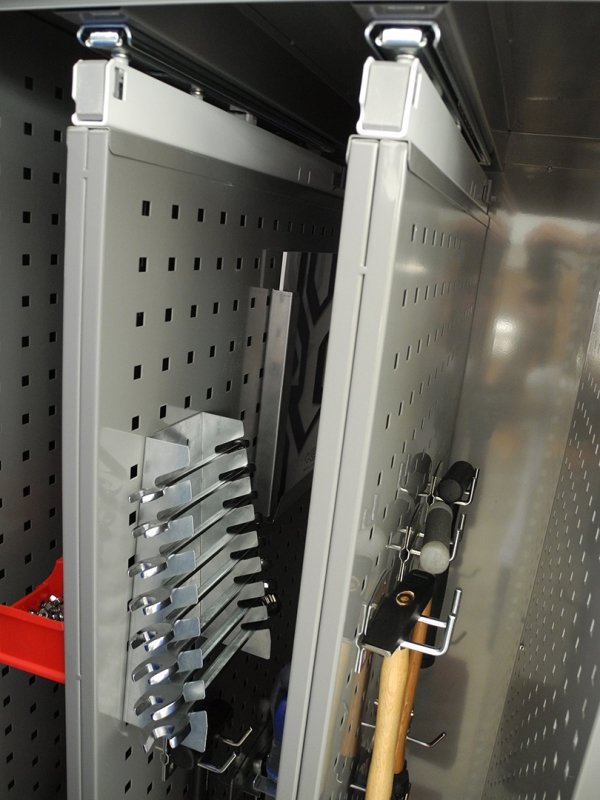 Universal workshop cabinet for neatly storing tools and equipment. Internal arrangement - 2 x extendable double-sided perforated full description and parameters