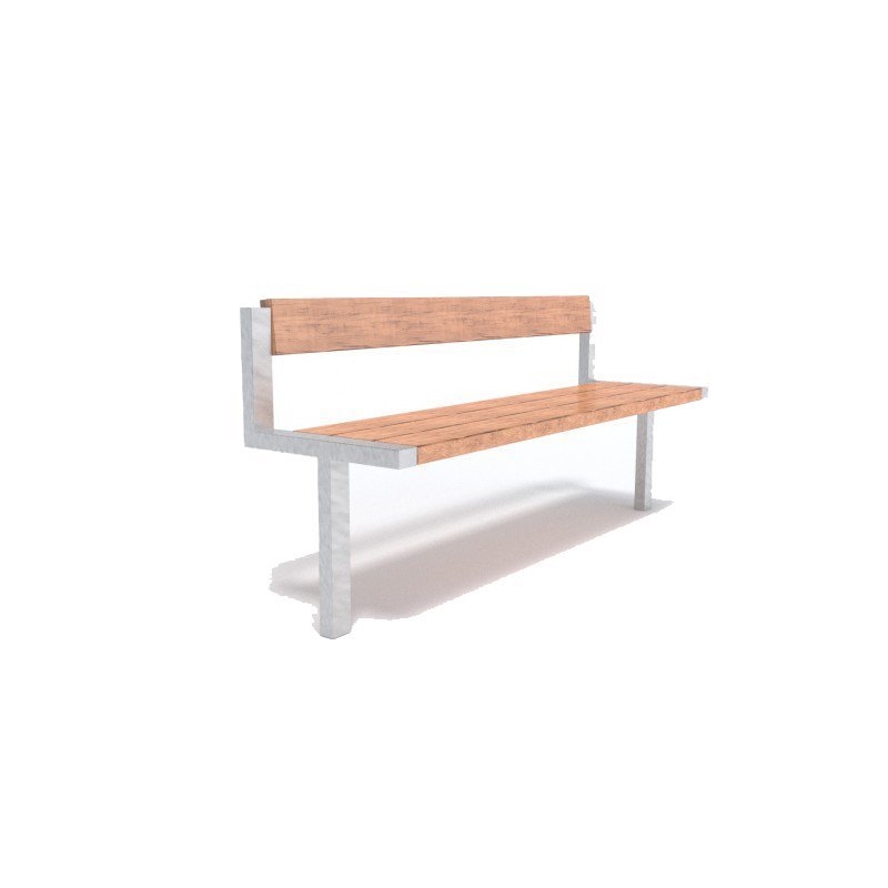 Design bench with backrest. The steel frame of the bench is powder-coated or hot-dip galvanized. Construction - steel 40 x 40 mm. Wooden slats spruce wood, treated with 3x glaze. Anchoring by concrete or screws. Seat height 450 mm, bench width 1500 mm. The dimensions of the slats are 1500 x 70 x 35 mm.
