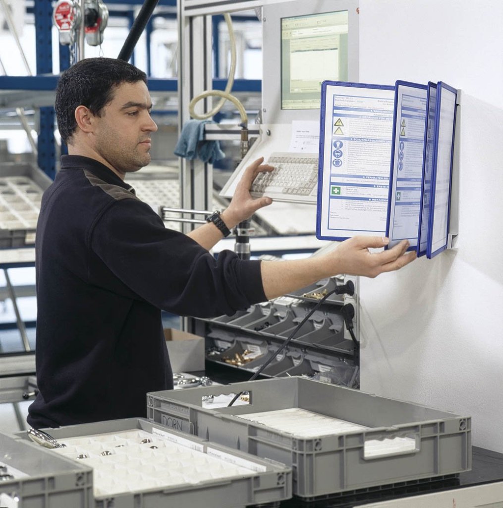 Magnetic wall holder with 5 SHERPA® presentation panels in A4 format in different colors. Easy handling and installation. Thanks to the all-over magnetic surface, the base can be attached to metal surfaces such as machines or shelving systems.