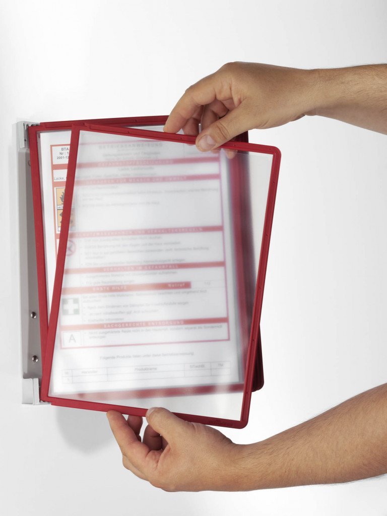 Wall holder with 5 SHERPA® presentation panels in A4 format in different colors. Easy handling and installation.