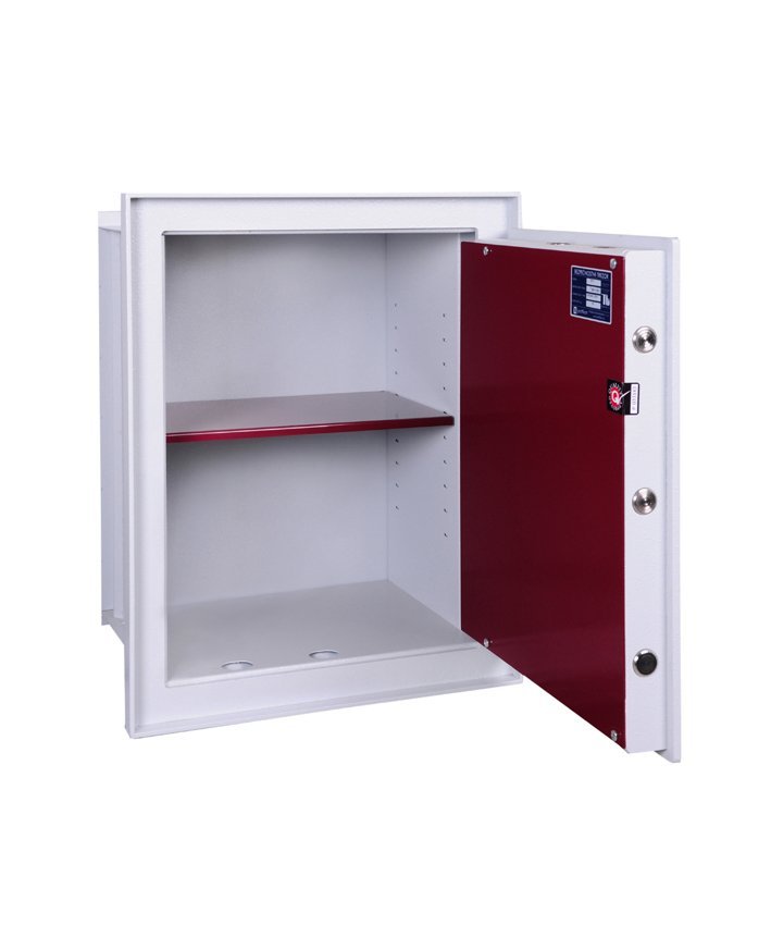 The wall-mounted safes are certified according to ČSN EN 1143-1 by the accredited certification body TREZOR TEST s. r. o. and are classified in security class I. They also have the NBU Secret certificate. Double-skin body and safe door. The inter-sheath space is filled with a system of steel reinforcements and fire-resistant material. The front part of the door is made of 8 mm steel. The lock mechanism and locking bolts are protected against drilling by a hardened steel armor plate. The locking mechanism for these safes is three-sided, the movable bars are 25 mm in diameter. The safes can be retrofitted with an internal box or extra shelves.