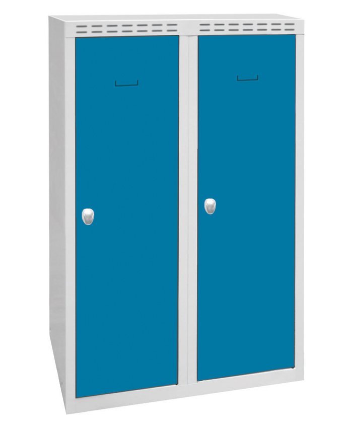 Double door wardrobe welded with double skin doors for greater security, height 1200 x width 600 x depth 500 mm. Locking with a cylinder lock or a padlock closure, interior equipment of each shelf compartment with a rod for hangers and a hook. On request with welded legs - cabinet height with legs 1350 mm. Body color RAL 7035 light gray.