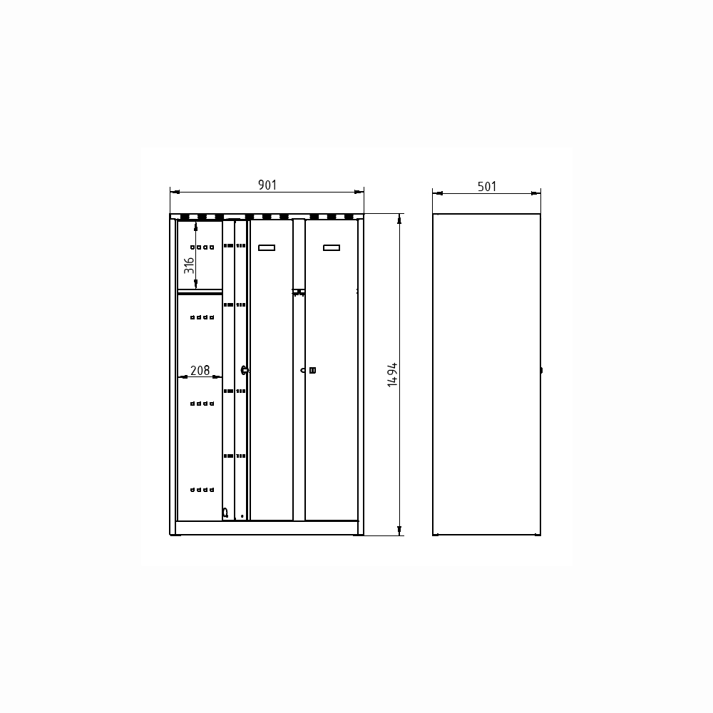 Three-door wardrobe welded with double-skin doors for greater security, height 1500 x width 900 x depth 500 mm. Locking with a cylinder lock or a padlock closure, interior equipment of each shelf compartment with a rod for hangers and a hook. On request with welded legs - cabinet height with legs 1650 mm. Body color RAL 7035 light gray.
