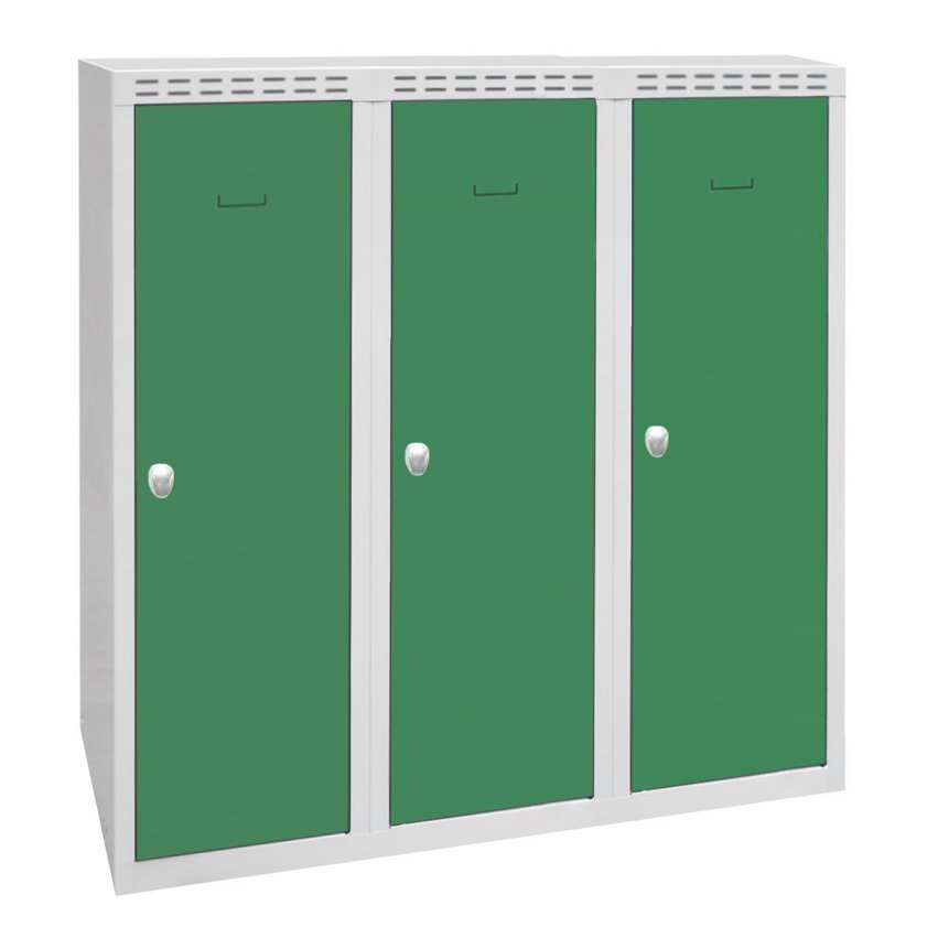Three-door wardrobe welded with double-skin doors for greater security, height 1200 x width 1200 x depth 500 mm. Locking with cylinder lock or padlock closure, interior equipment of each shelf compartment with rod for hangers and hook + vertical partition for separating clean and dirty clothes. On request with welded legs - cabinet height with legs 1350 mm. Body color RAL 7035 light gray.