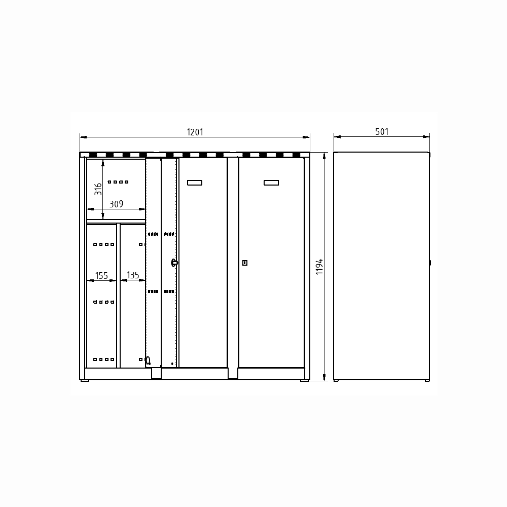 Three-door wardrobe welded with double-skin doors for greater security, height 1200 x width 1200 x depth 500 mm. Locking with full description and parameters