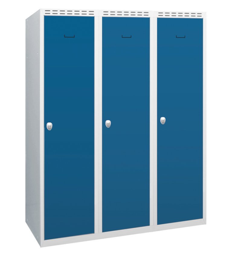 Three-door wardrobe welded with double-skin doors for greater security, height 1800 x width 900 x depth 500 mm. Locking with a cylinder lock or a padlock closure, interior equipment of each shelf compartment with a rod for hangers and a hook. On request with welded legs - cabinet height with legs 1950 mm. Body color RAL 7035 light gray.