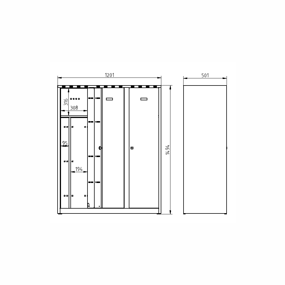 Three-door wardrobe welded with double-skin doors for greater security, height 1200 x width 900 x depth 500 mm. Locking with a cylinder lock or a padlock closure, interior equipment of each shelf compartment with a rod for hangers and a hook. On request with welded legs - cabinet height with legs 1350 mm. Body color RAL 7035 light gray.
