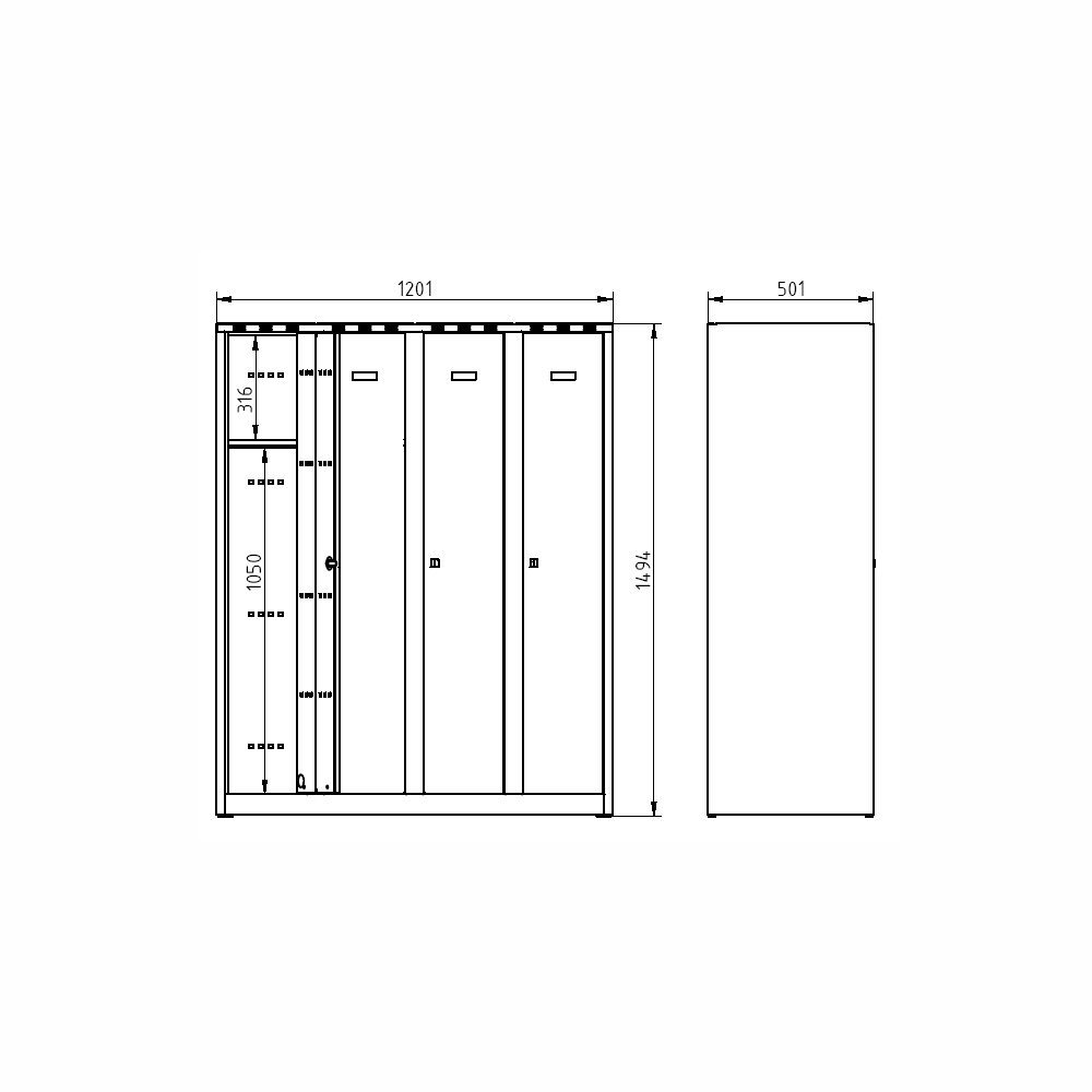 Four door wardrobe welded with double skin doors for greater security, height 1800 x width 1200 x depth 500 mm. Locking with a cylinder lock or a padlock closure, interior equipment of each shelf compartment with a rod for hangers and a hook. On request with welded legs - cabinet height with legs 1950 mm. Body color RAL 7035 light gray.