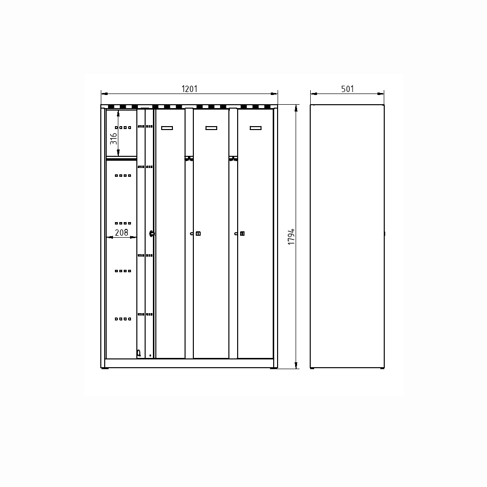 Three-door wardrobe welded with double-skin doors for greater security, height 1800 x width 1200 x depth 500 mm. Locking with cylinder lock or padlock closure, interior equipment of each shelf compartment with rod for hangers and hook + vertical partition for separating clean and dirty clothes. On request with welded legs - cabinet height with legs 1950 mm. Body color RAL 7035 light gray.