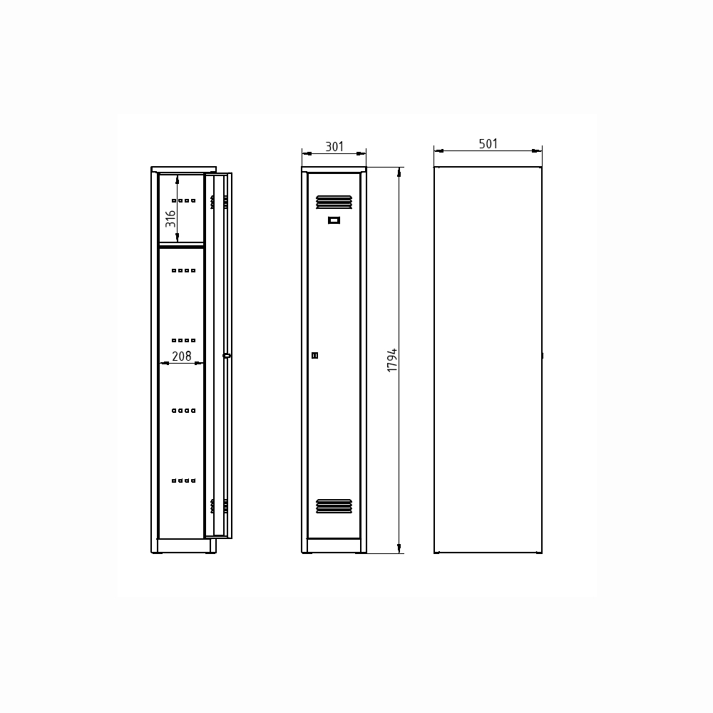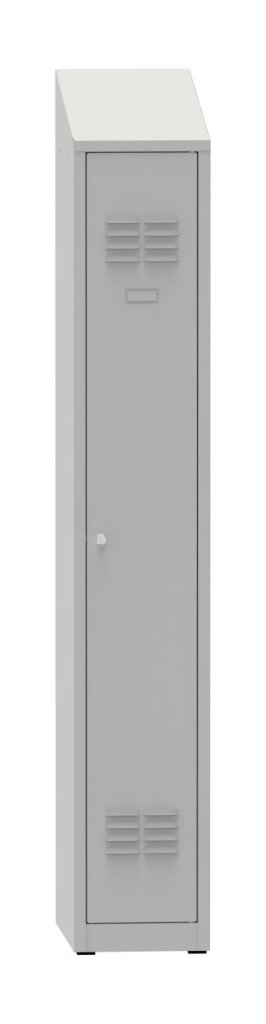 Welded wardrobe, height 1800 x width 300 x depth 500 mm. Locking with cylinder lock or padlock closure, interior shelf with hanger rod and hook. On request with welded legs - cabinet height with legs 1950 mm. Body color RAL 7035 light gray.
