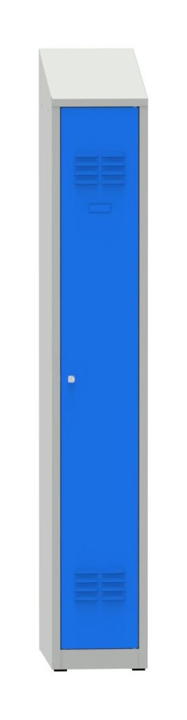 Wardrobe welded, height 1500 x width 400 x depth 500 mm. Locking with a cylinder lock or a padlock closure, internal equipment of a shelf with a rod for hangers and a hook + a vertical partition to separate clean and dirty clothes. On request with welded legs - cabinet height with legs 1650 mm. Body color RAL 7035 light gray.