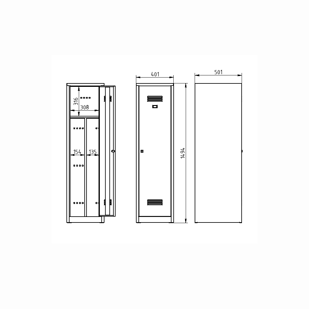 Wardrobe welded, height 1500 x width 400 x depth 500 mm. Locking with a cylinder lock or a padlock closure, internal equipment of a shelf with a rod for hangers and a hook + a vertical partition to separate clean and dirty clothes. On request with welded legs - cabinet height with legs 1650 mm. Body color RAL 7035 light gray.