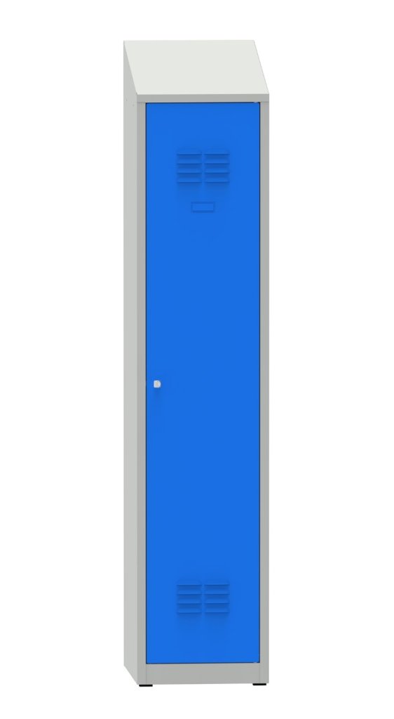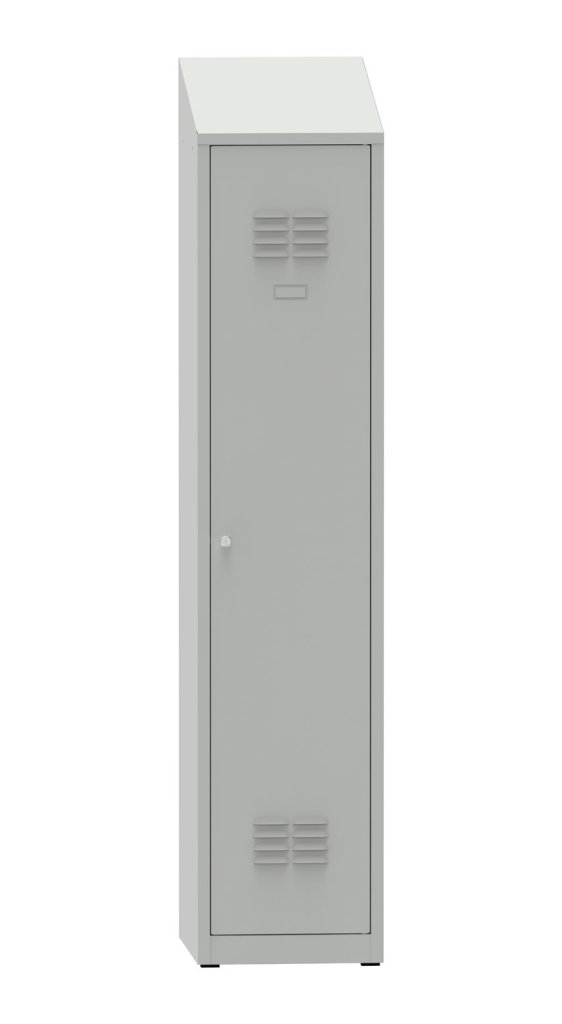Welded wardrobe, height 1800 x width 300 x depth 500 mm. Locking with cylinder lock or padlock closure, interior shelf with hanger rod and hook. On request with welded legs - cabinet height with legs 1950 mm. Body color RAL 7035 light gray.