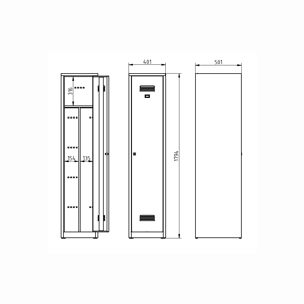 Wardrobe welded, height 1500 x width 400 x depth 500 mm. Locking with a cylinder lock or a padlock closure, internal equipment of a shelf with a rod for hangers and a hook + a vertical partition to separate clean and dirty clothes. On request with welded legs - cabinet height with legs 1650 mm. Body color RAL 7035 light gray.
