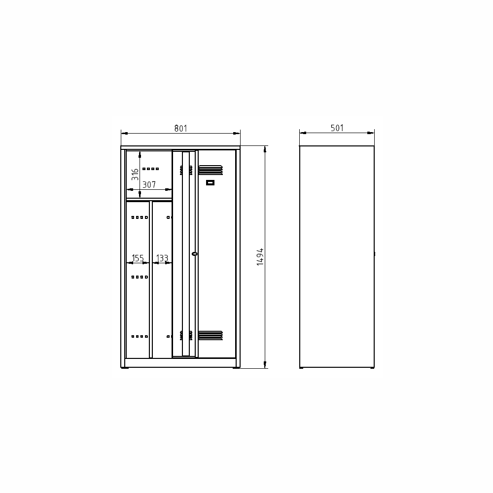 Two-door welded wardrobe, height 1500 x width 800 x depth 500 mm. Locking with a cylinder lock or a padlock closure, interior equipment of each shelf compartment with a rod for hangers and a hook + partition for separating clean and dirty clothes. On request with welded legs - cabinet height with legs 1650 mm. Body color RAL 7035 light gray.
