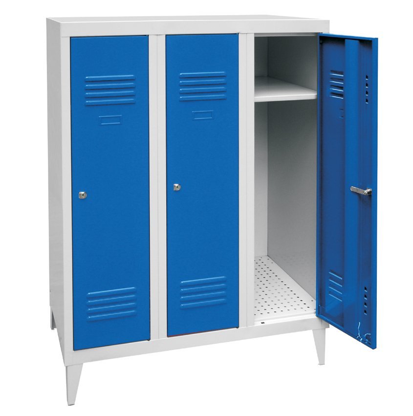 Three-door welded wardrobe, height 1800 x width 900 x depth 500 mm. Locking with a cylinder lock or a padlock closure, interior equipment of each shelf compartment with a rod for hangers and a hook. On request with welded legs - cabinet height with legs 1950 mm. Body color RAL 7035 light gray.