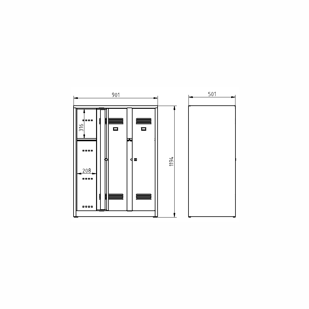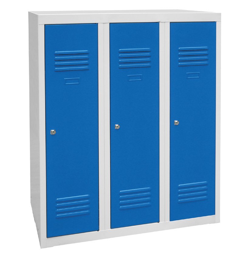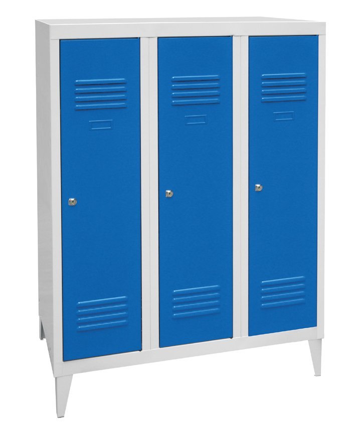 Three-door welded wardrobe, height 1200 x width 900 x depth 500 mm. Locking with a cylinder lock or a padlock closure, interior equipment of each shelf compartment with a rod for hangers and a hook. On request with welded legs - cabinet height with legs 1350 mm. Body color RAL 7035 light gray.