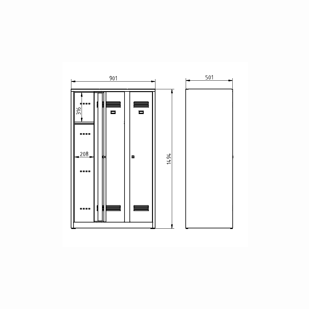 Three-door welded wardrobe, height 1800 x width 900 x depth 500 mm. Locking with a cylinder lock or a padlock closure, interior equipment of each shelf compartment with a rod for hangers and a hook. On request with welded legs - cabinet height with legs 1950 mm. Body color RAL 7035 light gray.