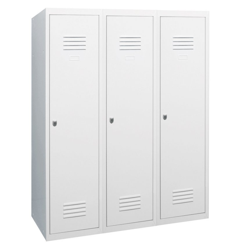 Three-door welded wardrobe, height 1800 x width 900 x depth 500 mm. Locking with a cylinder lock or a padlock closure, interior equipment of each shelf compartment with a rod for hangers and a hook. On request with welded legs - cabinet height with legs 1950 mm. Body color RAL 7035 light gray.