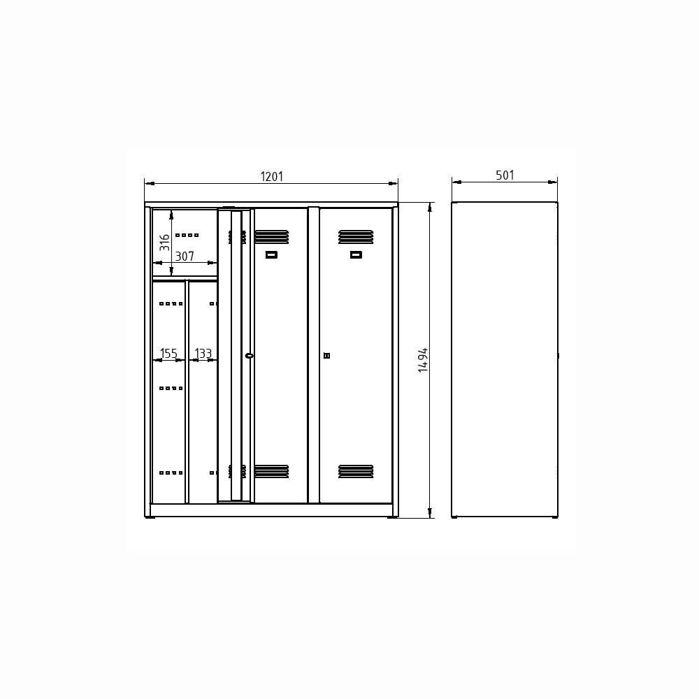 Four-door welded wardrobe, height 1200 x width 1200 x depth 500 mm. Locking with a cylinder lock or a padlock closure, interior equipment of each shelf compartment with a rod for hangers and a hook. On request with welded legs - cabinet height with legs 1350 mm. Body color RAL 7035 light gray.