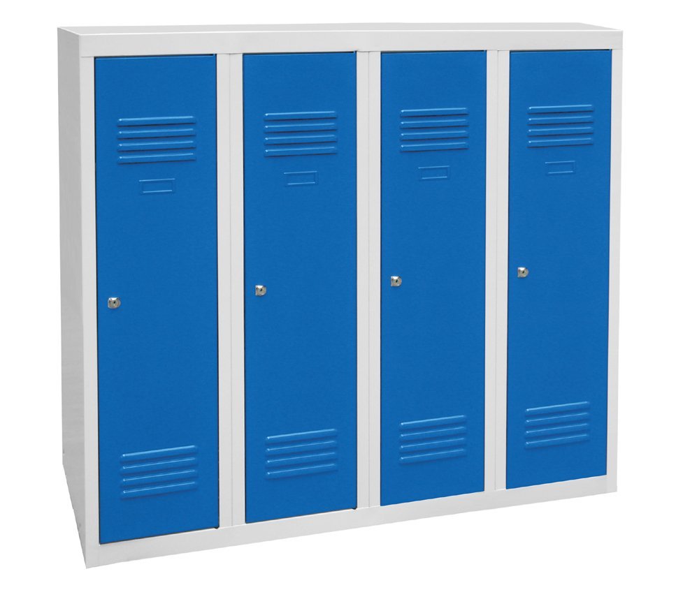 Four-door welded wardrobe, height 1800 x width 1200 x depth 500 mm. Locking with a cylinder lock or a padlock closure, interior equipment of each shelf compartment with a rod for hangers and a hook. On request with welded legs - cabinet height with legs 1950 mm. Body color RAL 7035 light gray.