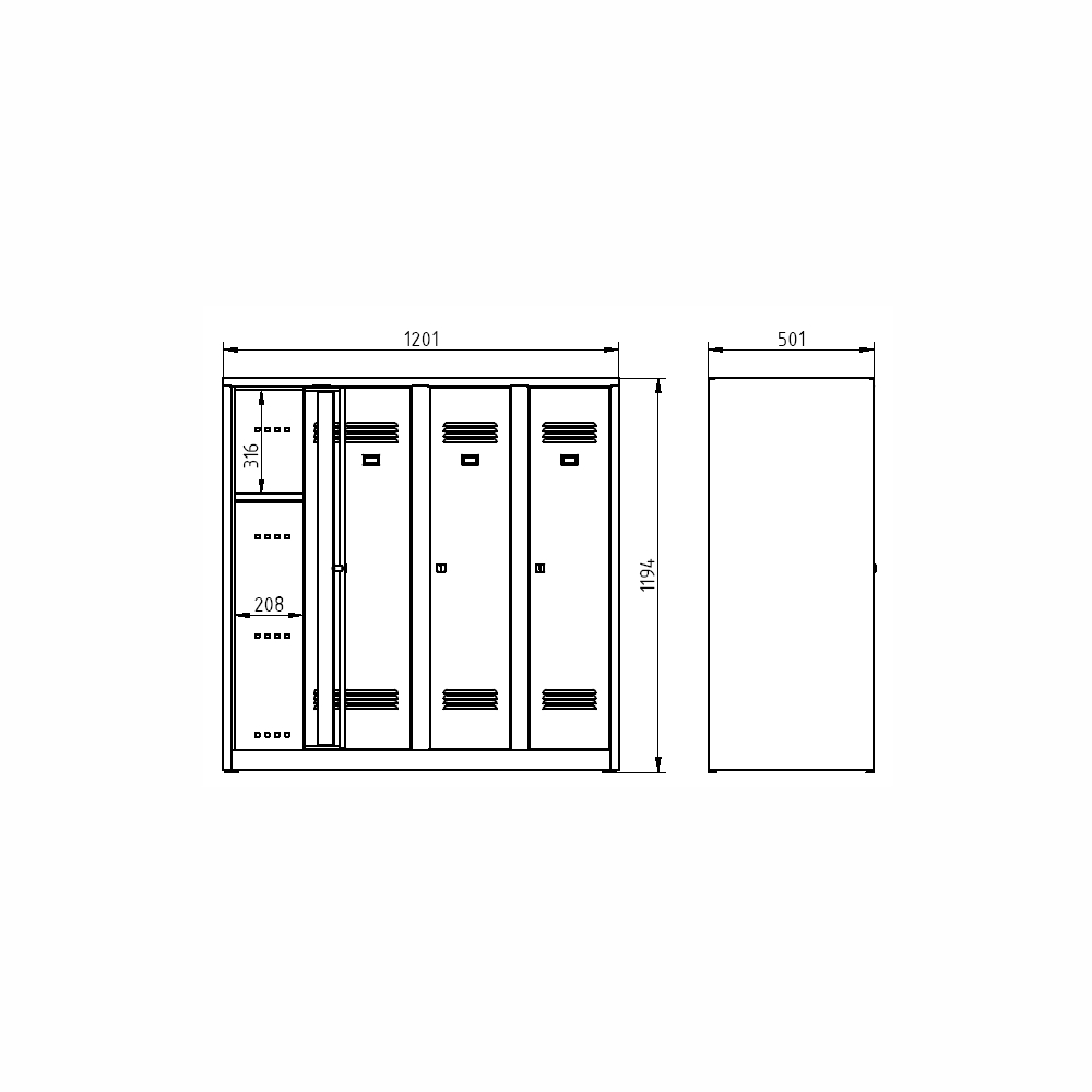Three-door welded wardrobe, height 1200 x width 1200 x depth 500 mm. Locking with cylinder lock or padlock closure, interior equipment of each shelf compartment with rod for hangers and hook + vertical partition for separating clean and dirty clothes. On request with welded legs - cabinet height with legs 1350 mm. Body color RAL 7035 light gray.