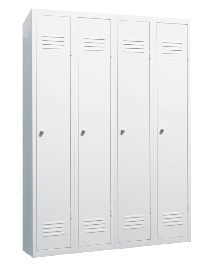 Four-door welded wardrobe, height 1500 x width 1200 x depth 500 mm. Locking with a cylinder lock or a padlock closure, interior equipment of each shelf compartment with a rod for hangers and a hook. On request with welded legs - cabinet height with legs 1650 mm. Body color RAL 7035 light gray.