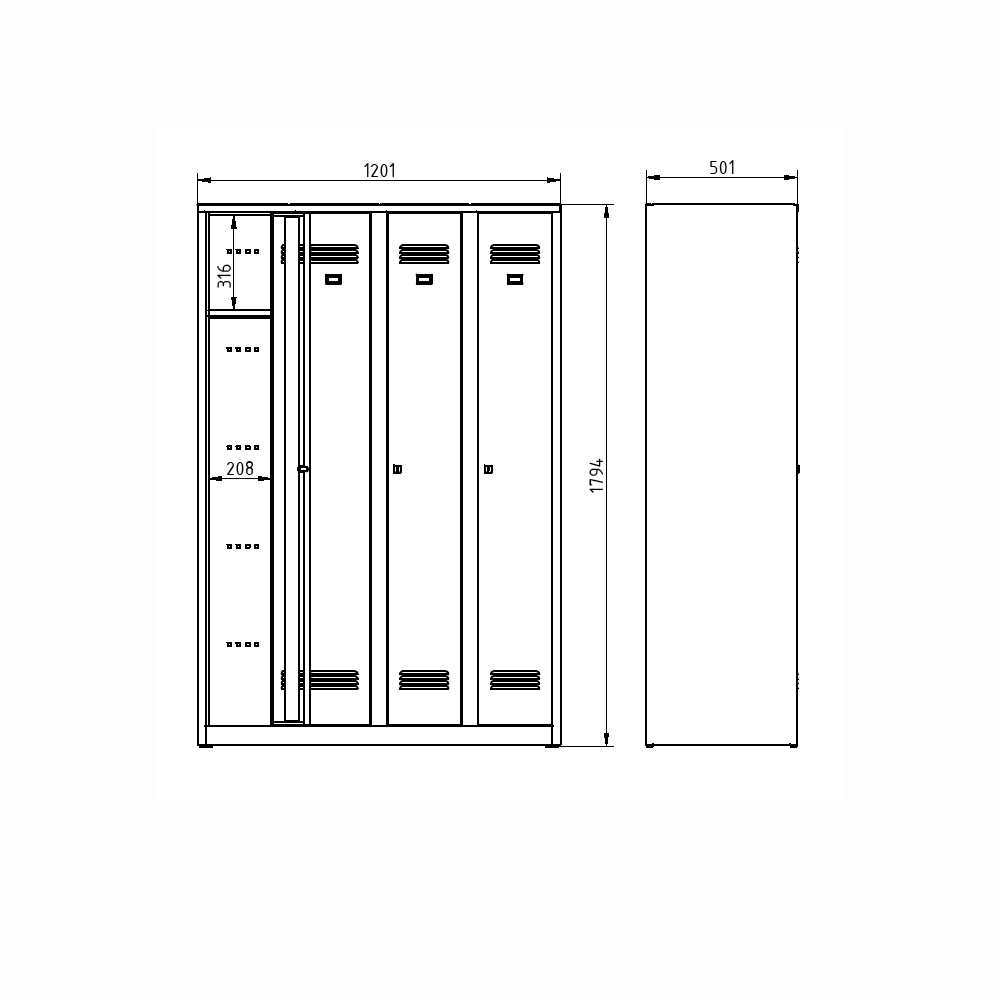 Three-door welded wardrobe, height 1200 x width 1200 x depth 500 mm. Locking with cylinder lock or padlock closure, interior equipment of each shelf compartment with rod for hangers and hook + vertical partition for separating clean and dirty clothes. On request with welded legs - cabinet height with legs 1350 mm. Body color RAL 7035 light gray.
