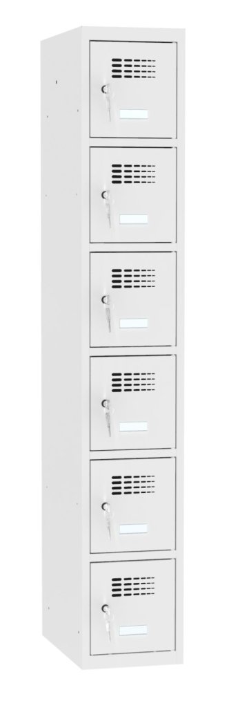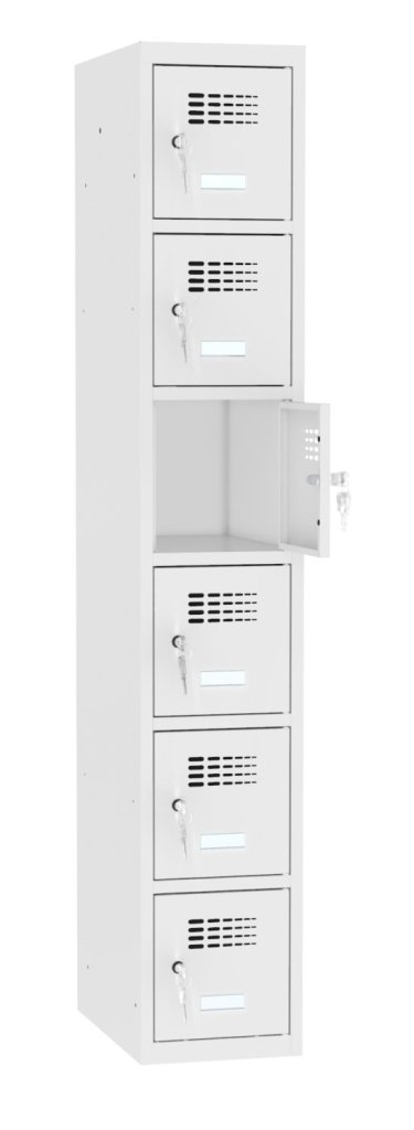 Six-door metal wardrobe with welded construction and modern ventilation system design. Height 1800 x width 300 x depth 500 mm. Self-adhesive name tag on the door. 16 color shades to choose from included in the price without extra charge. Different types of locking.