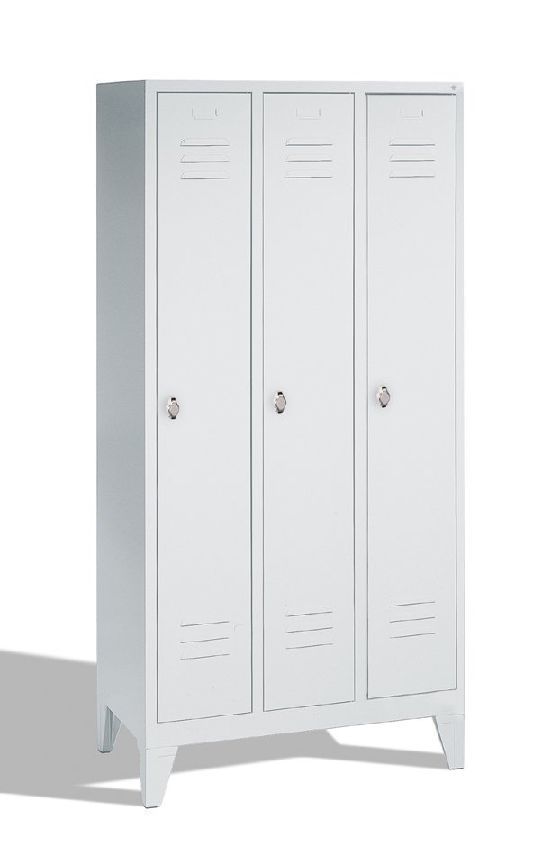 Three-door welded wardrobe, height 1500 x width 900 x depth 500 mm. Locking with a cylinder lock or a padlock closure, interior equipment of each shelf compartment with a rod for hangers and a hook. On request with welded legs - cabinet height with legs 1650 mm. Body color RAL 7035 light gray.