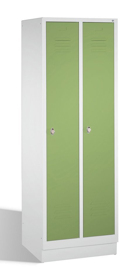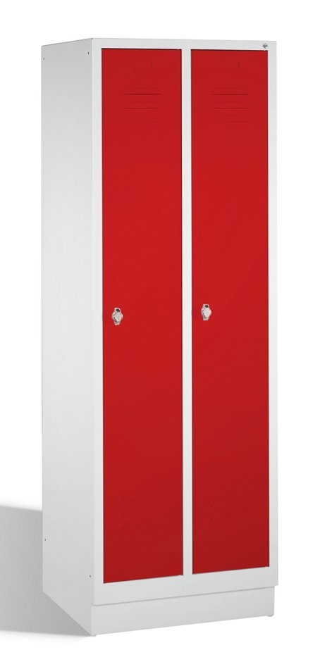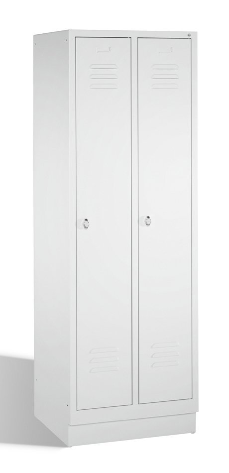 Two-door metal wardrobe on plinth width 600, height 1800, depth 500 mm, cylinder lock or padlock closure. Can be combined with a bench type A7660. Body color RAL 7035 light gray.