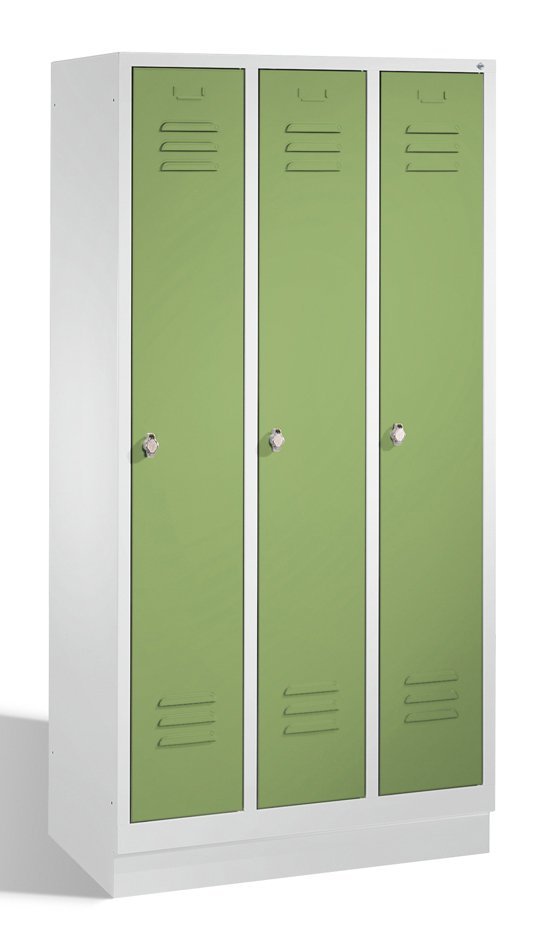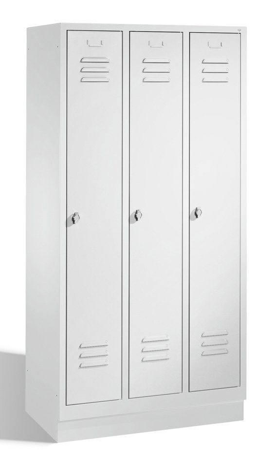 Three-door metal wardrobe on plinth width 900, height 1800, depth 500 mm, cylinder lock or padlock closure. Body color RAL 7035 light gray.