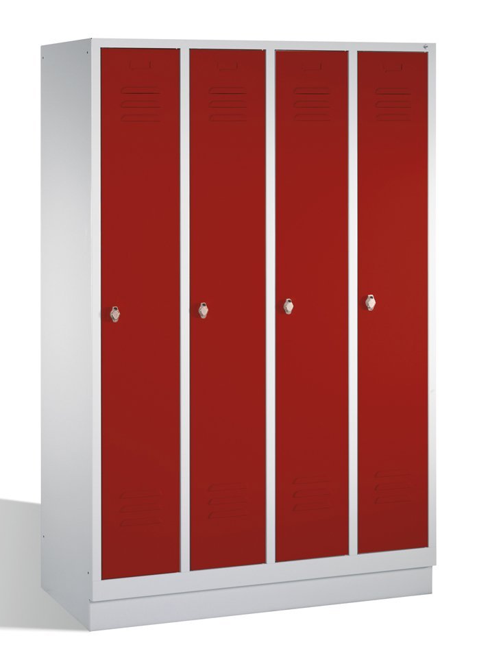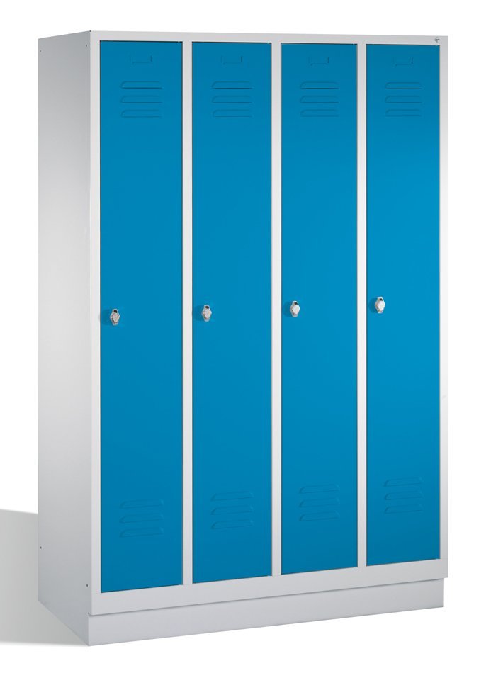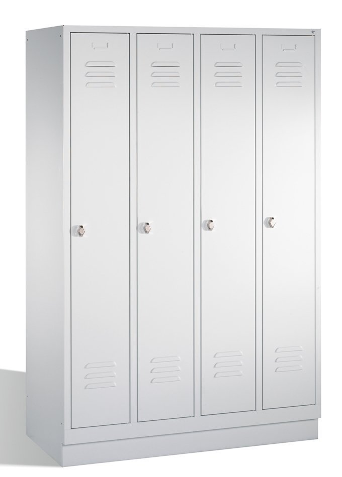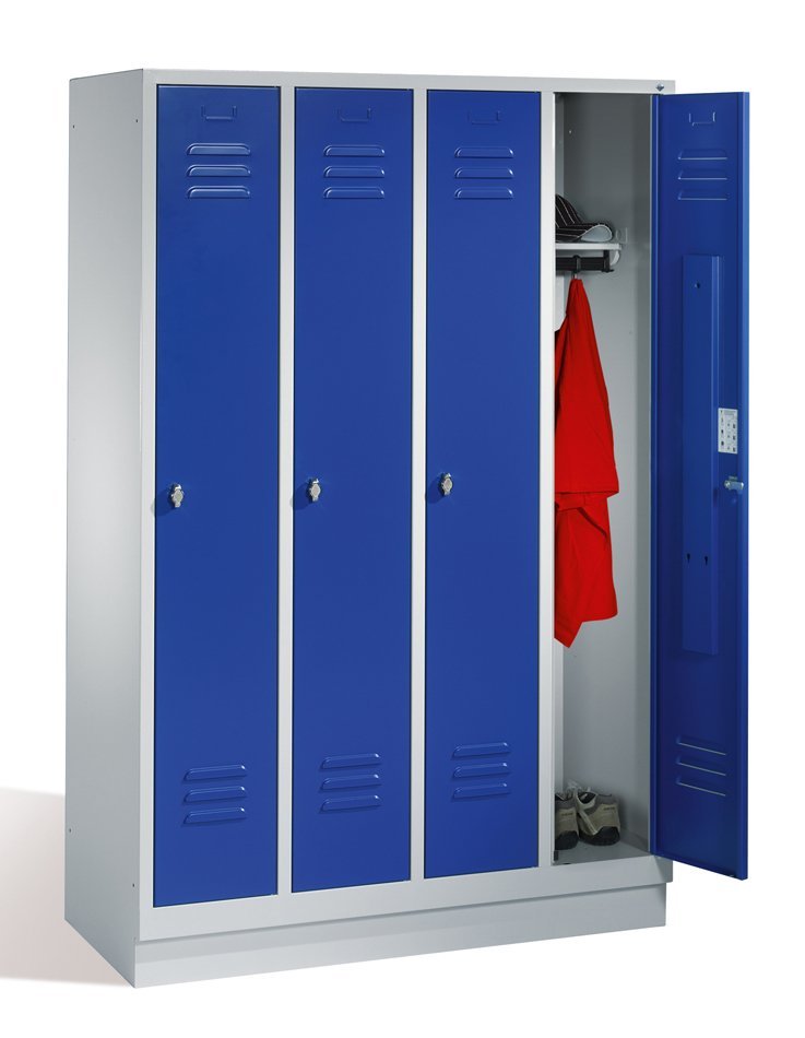 Four-door wardrobe on plinth with robust steel construction. Part of each department - shelf, rod, 3 hooks. Padlock closure. Body color - light gray RAL 7035, door color of your choice. Dimensions in mm (H x W x D) 1800 x 1190 x 500.