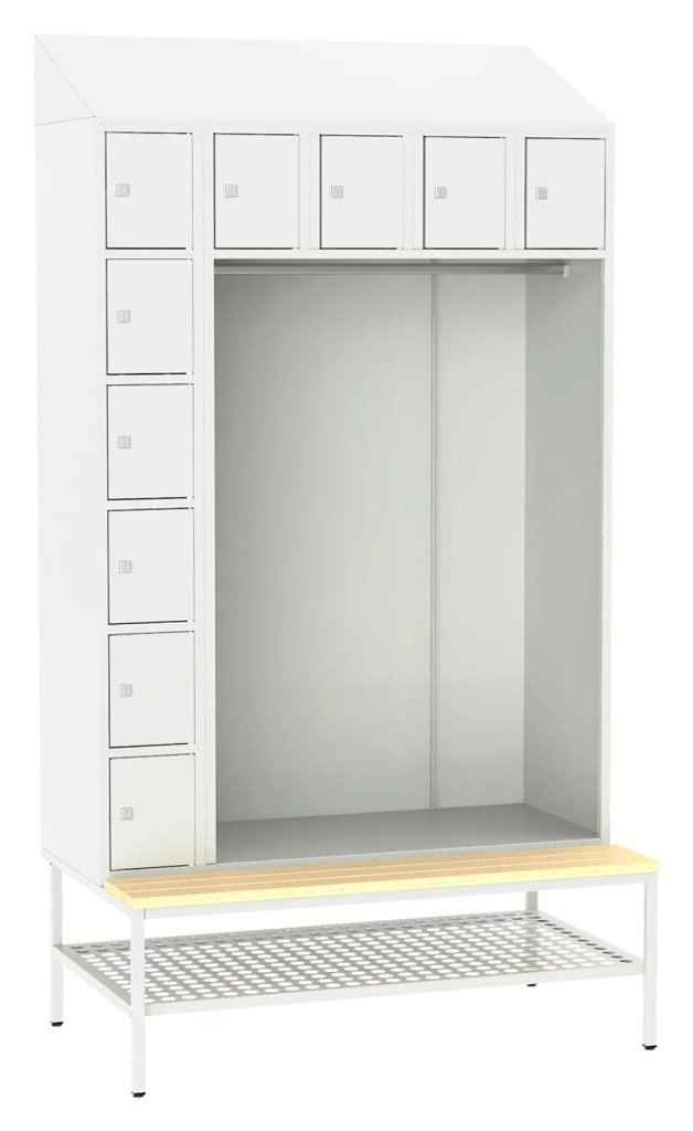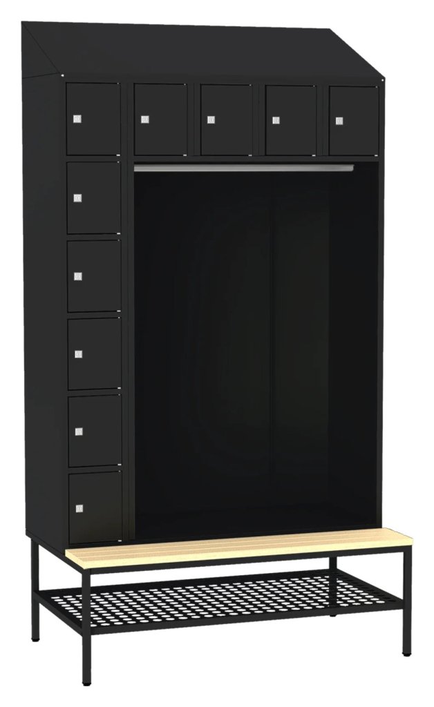 Open wardrobe sets are a practical solution for social rooms or dressing rooms, where it is not necessary to store clothes in separate cupboards. 10x storage box for small personal items, clothes rail for hangers, wooden bench, perforated storage rack for shoes. 16 color shades to choose from included in the price without extra charge.