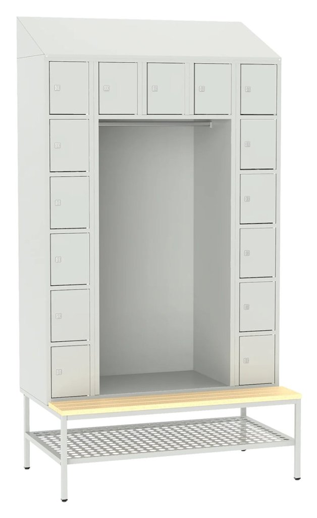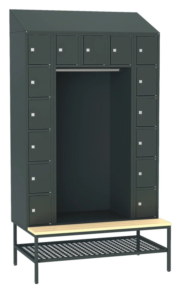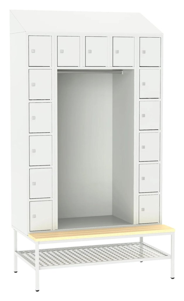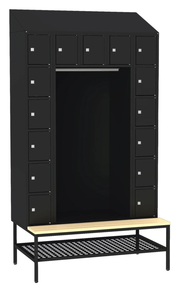 Open wardrobe sets are a practical solution for social rooms or dressing rooms, where it is not necessary to store clothes in separate cupboards. 15x storage box for small personal items, clothes rail for hangers, wooden bench, perforated storage rack for shoes. 16 color shades to choose from included in the price without extra charge.