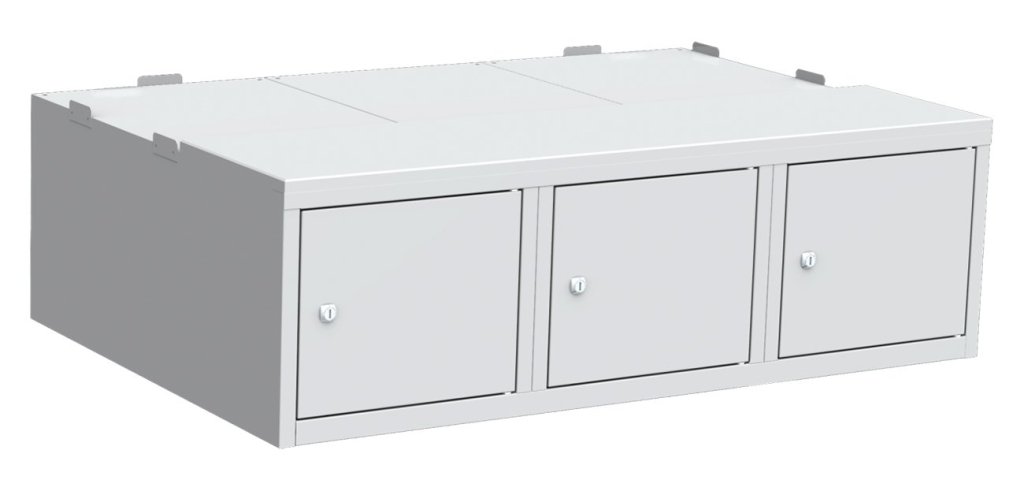 Wardrobe pedestal with three doors, width 900, height 370, depth 810 mm. Body color RAL 7035 light gray.