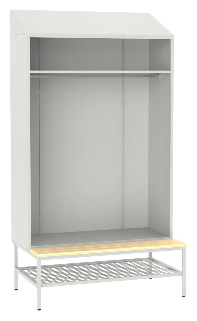 Open wardrobe sets are a practical solution for social rooms or dressing rooms, where it is not necessary to store clothes in separate cupboards. Storage shelves, clothes rail for hangers, wooden bench, perforated storage rack for shoes. 16 color shades to choose from included in the price without extra charge.