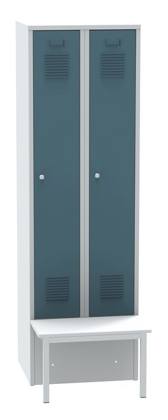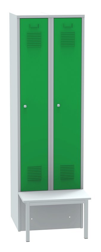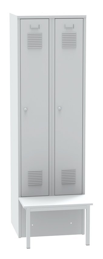 Two-door metal wardrobe with a raised bench with a grate - height 1850, width 600, depth 810 mm. Body color RAL 7035 light gray.