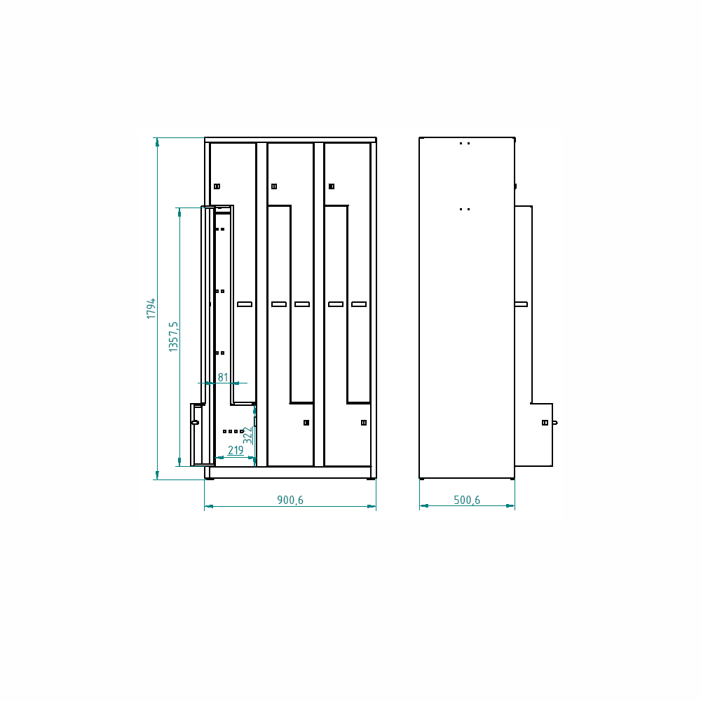 Wardrobe with Z-shaped doors on plinth or legs. Height 1800 x width 900 x depth 500 mm, 6 compartments. Three-point locking mechanism, key locking or padlock closure. Body color RAL 7035 light gray.